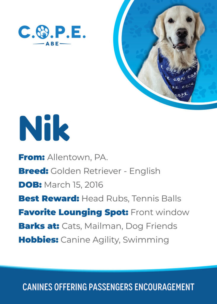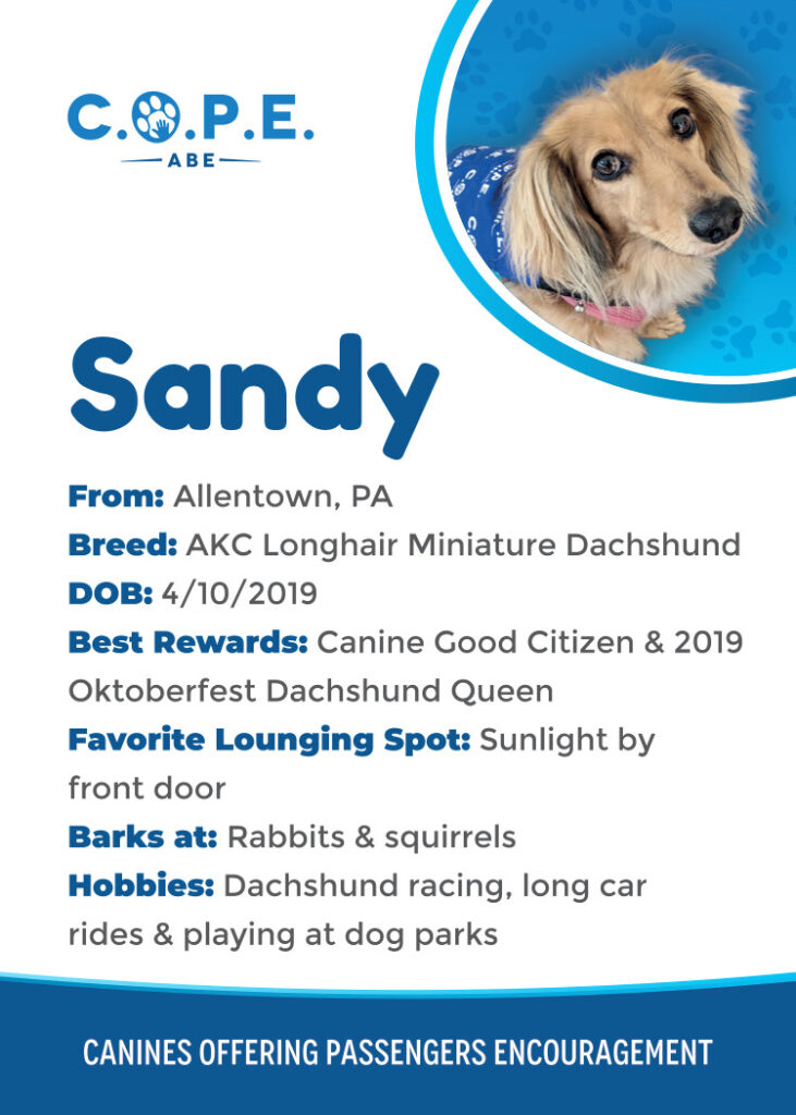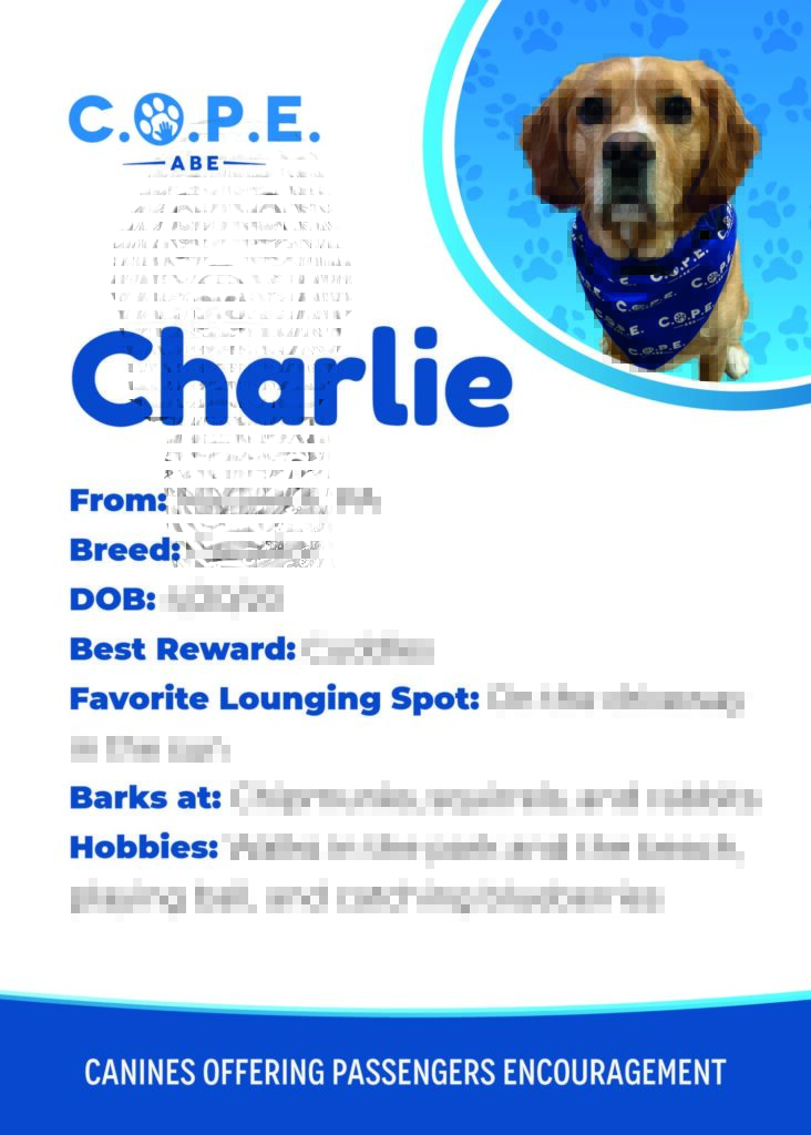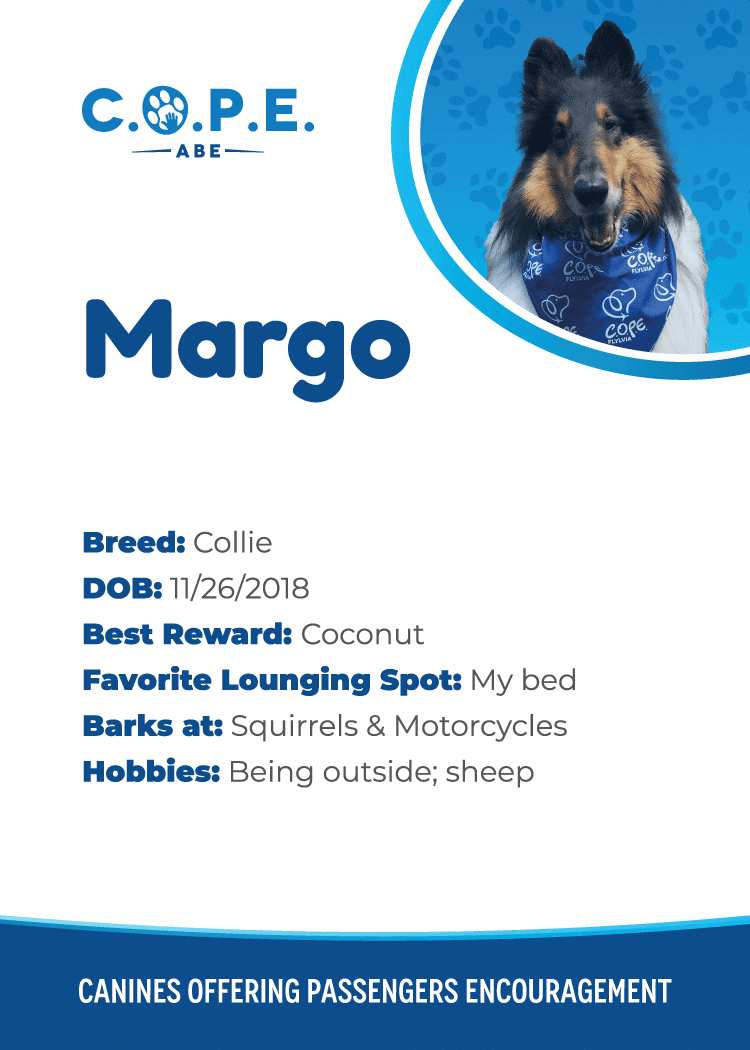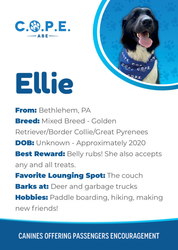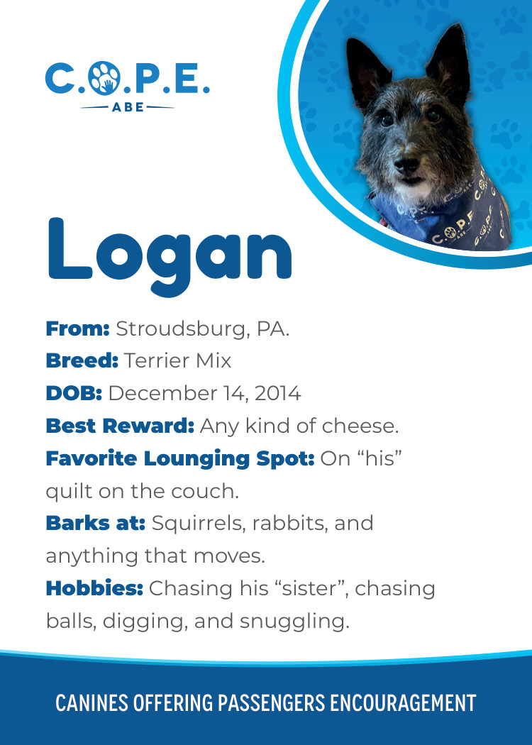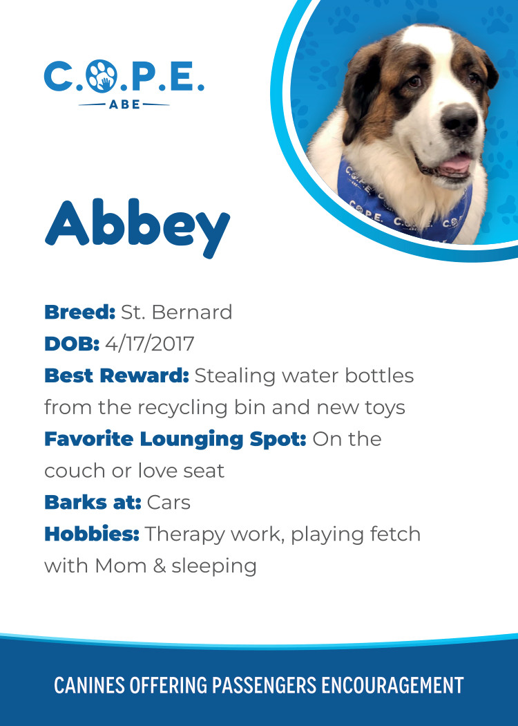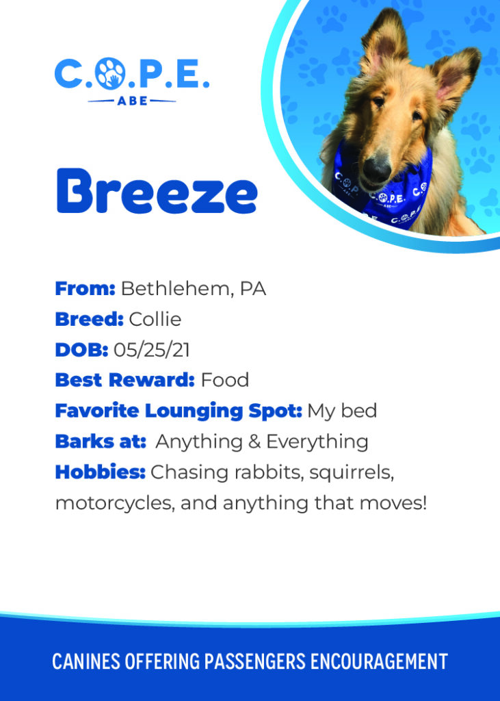 All Flight InformationMeet our C.O.P.E. crew! Check out some of our volunteer’s favorite hobbies and best rewards, as well as more information about their breeds and ages. Please say hello next time you are traveling through ABE!