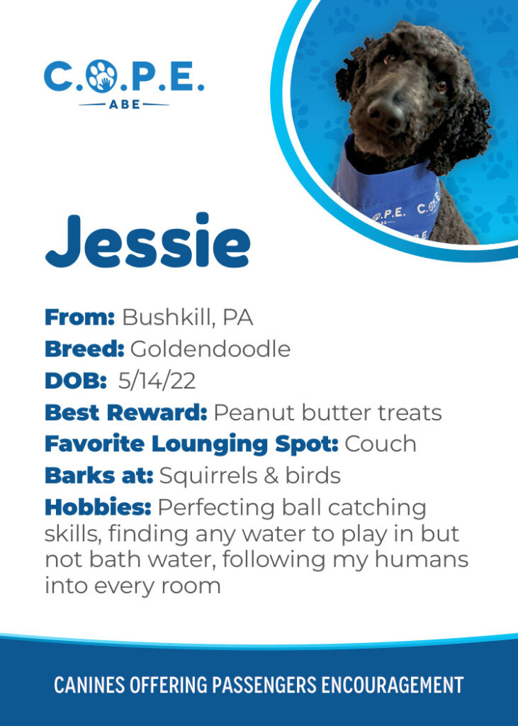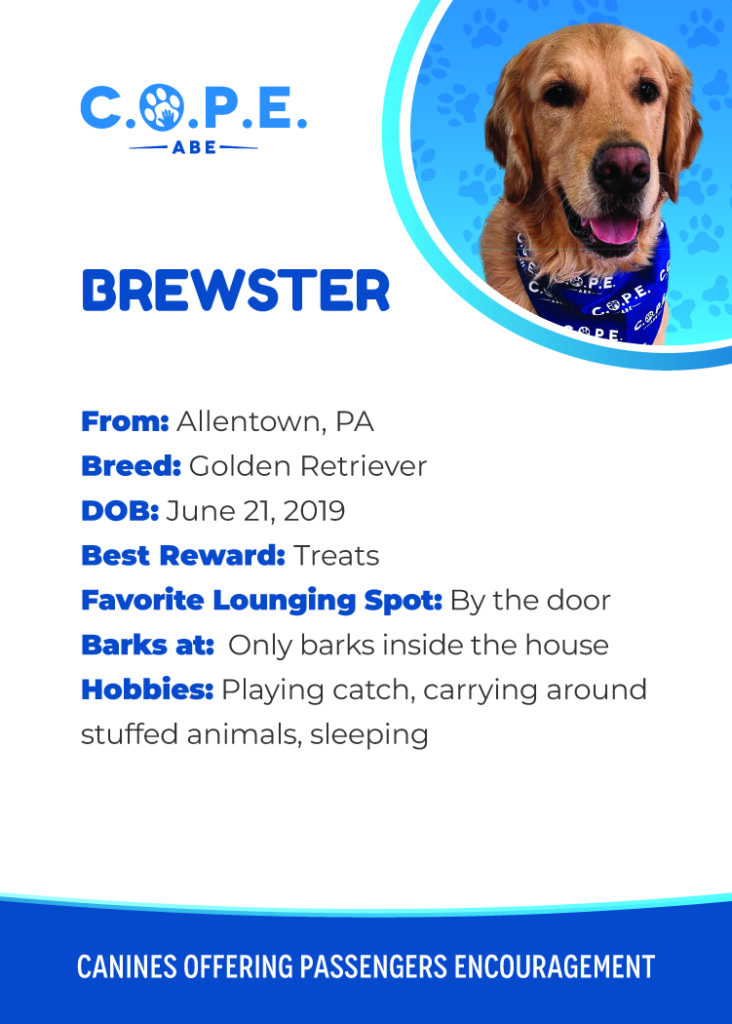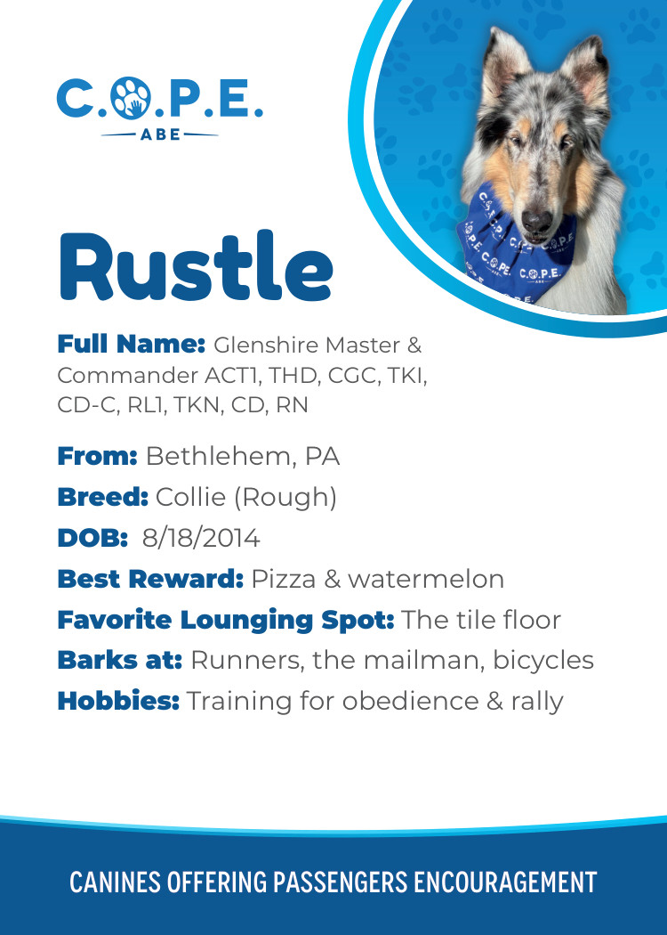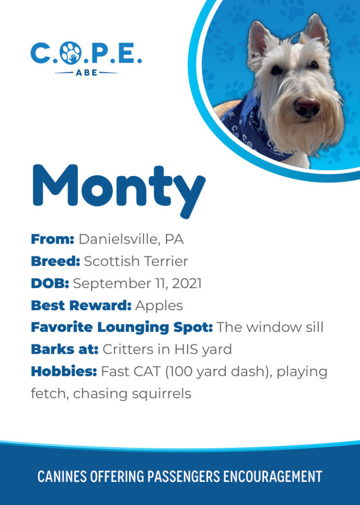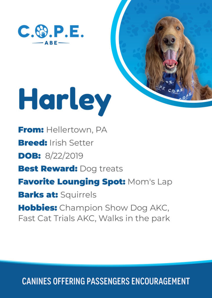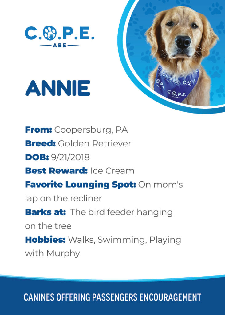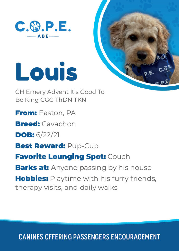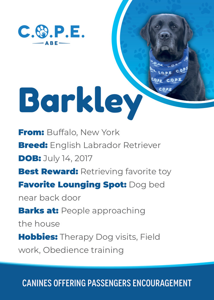 All Flight InformationMeet our C.O.P.E. crew! Check out some of our volunteer’s favorite hobbies and best rewards, as well as more information about their breeds and ages. Please say hello next time you are traveling through ABE!