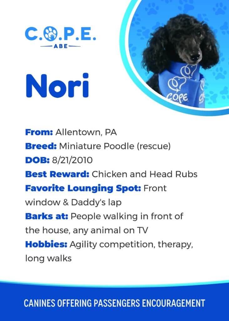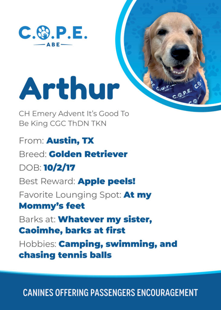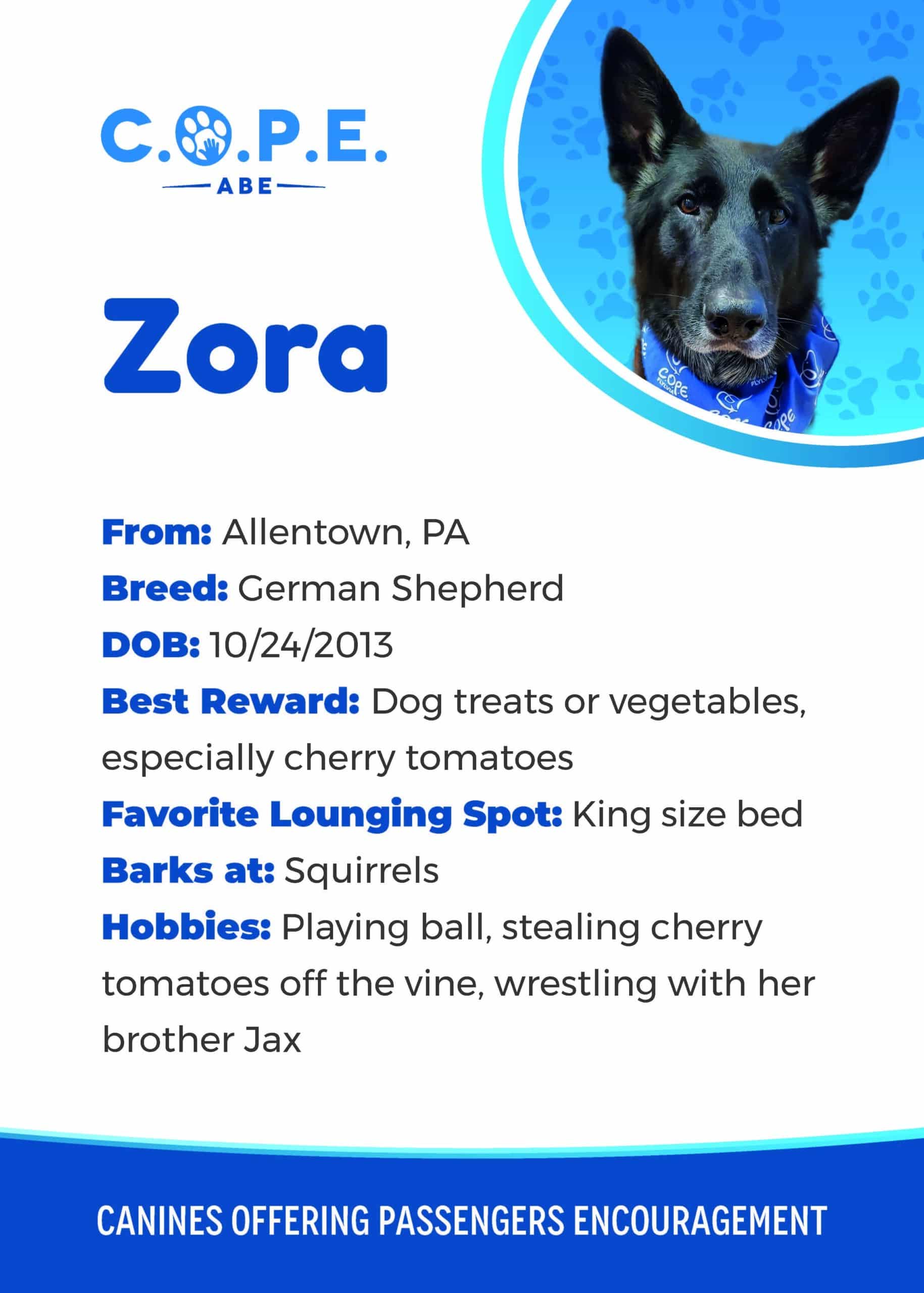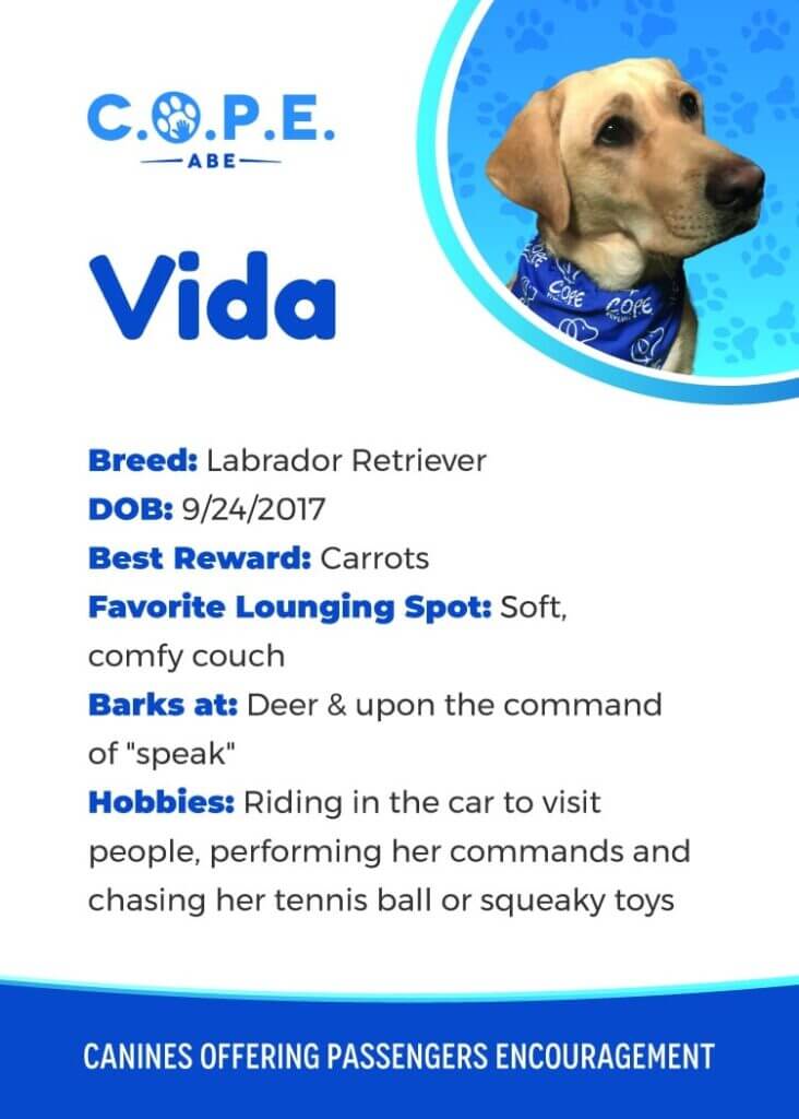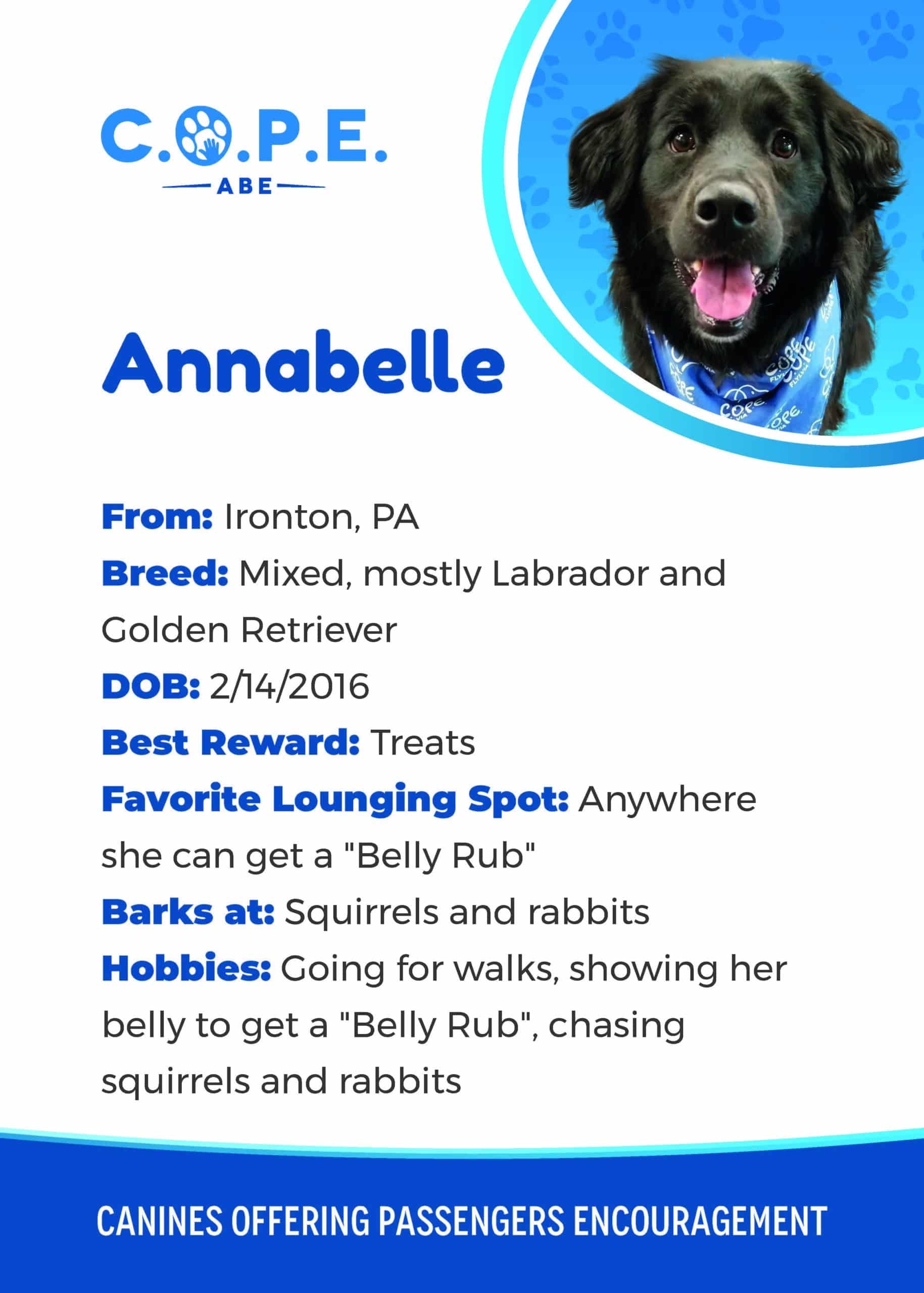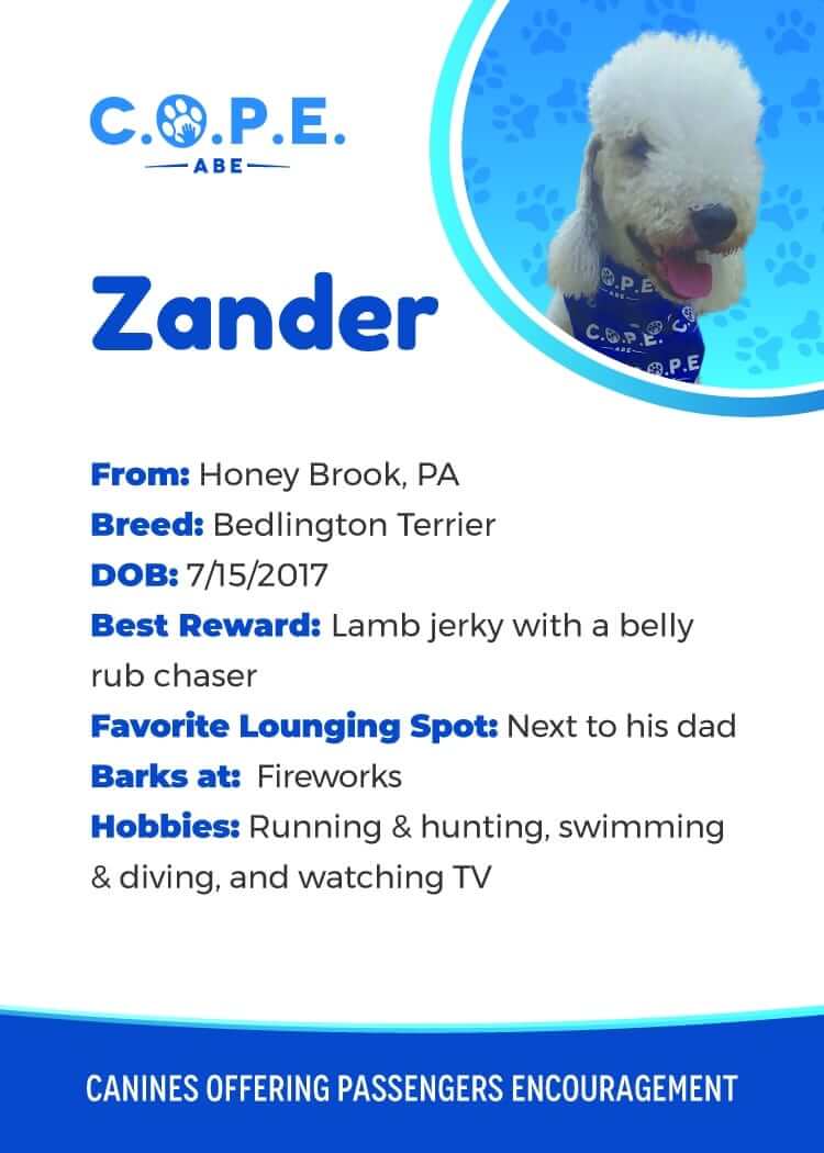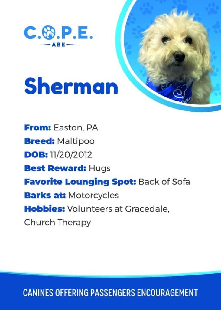 All Flight InformationMeet our C.O.P.E. crew! Check out some of our volunteer’s favorite hobbies and best rewards, as well as more information about their breeds and ages. Please say hello next time you are traveling through ABE!
